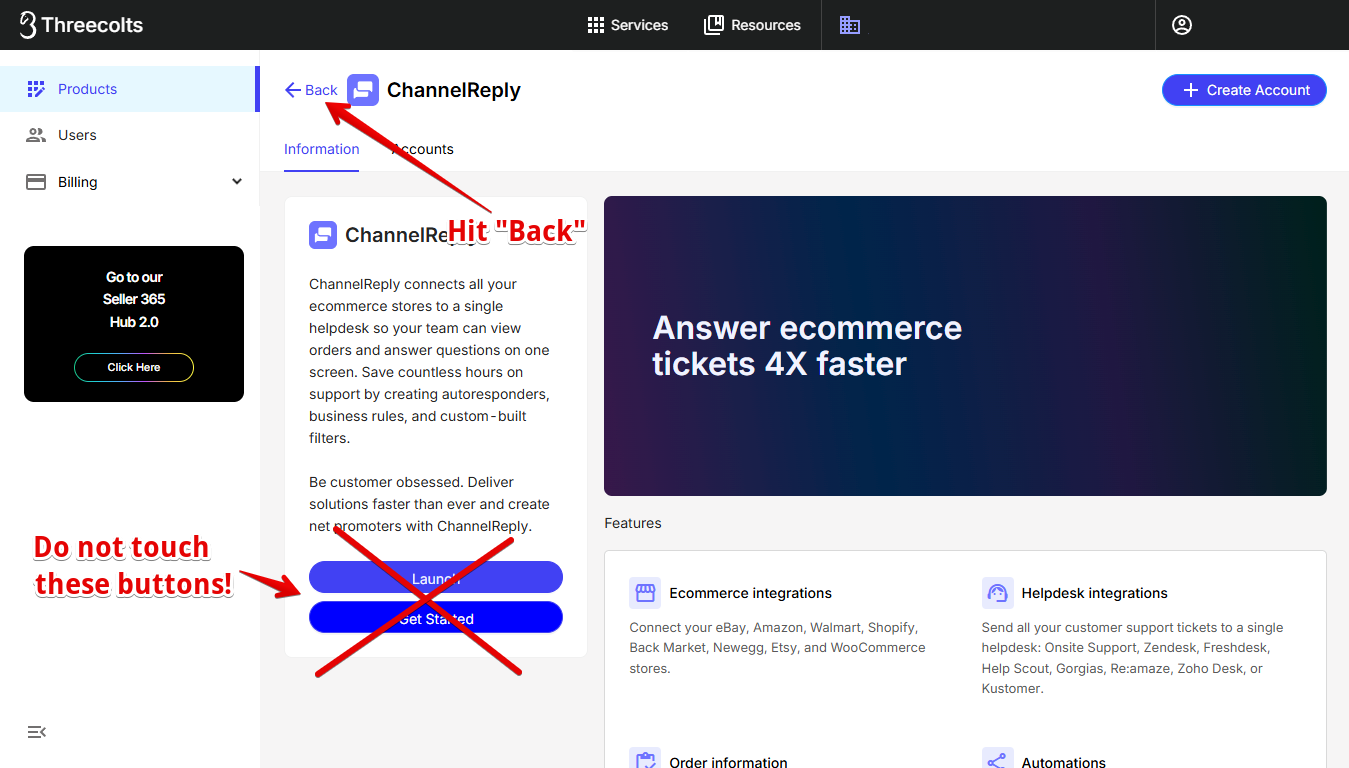 Once you finish creating your ChannelReply account, you'll arrive at the screen shown below. Do not click "Get started" or "Launch"! There are known bugs here that can create extra ChannelReply accounts, with the potential for a lot of confusion and problems down the road. Click "Back" at the top of the screen instead.