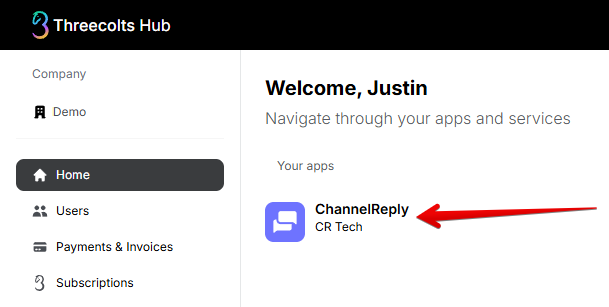 Sign in to Threecolts Hub as the account that has ChannelReply connected. You should see ChannelReply listed under "Your apps" on your Threecolts dashboard.