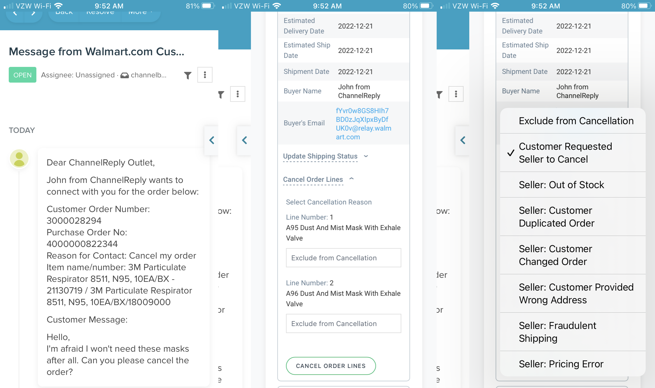 Above: Three screenshots of processing a Walmart cancellation with ChannelReply on the Re:amaze iOS mobile app. From left to right: Viewing the notification, viewing the cancellation action, and choosing the reason for canceling.